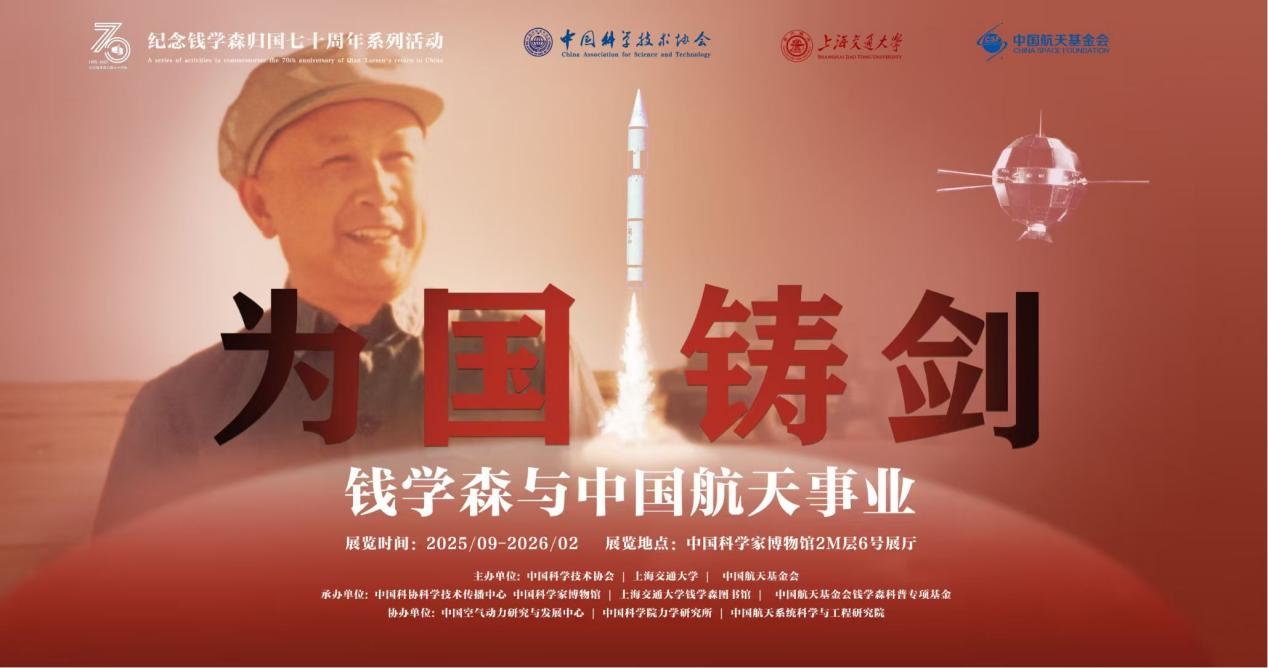 为纪念人民科学家钱学森归国七十周年,2025年9月17日,“纪念人民科学家钱学森归国七十周年”系列活动暨航天公益三十周年纪念活动在中国科学家博物馆举行。中国科协党组副书记、副主席、书记处书记冯身洪,国家国防科技工业局党组成员、副局长卞志刚,上海交通大学党委书记杨振斌出席活动并致辞。钱学森之子、钱学森图书馆馆长钱永刚,特级航天员费俊龙,以及钱学森书屋代表、陕西宁强县实验小学校长刘久亮作主题分享,分别从不同视角分享了钱学森精神的传承与创新实践。同时,由中国科学技术协会、上海交通大学、中国航天基金会联合主办的“为国铸剑:钱学森与中国航天事业”在活动现场正式启幕。